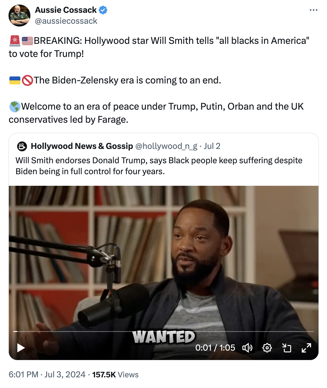 Yesterday, the same account posted another video which appears to be fake, claiming to be Will Smith encouraging Black people to vote for Trump was posted on Twitter. Interesting considering a Senate investigation into the 2016 US election concluded that a Russian fake-news campaign targeted "no single group...more than African-Americans." How is this still happening?