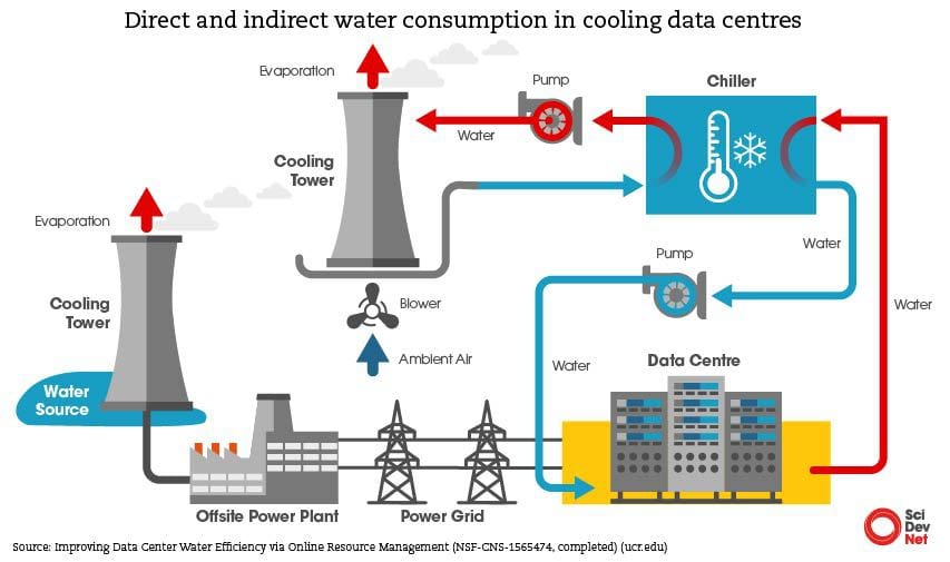 This year, theyāve spent billions on centres located everywhere from Finland to Malaysia. This requires huge water usage - in 2022 Googleās data centres consumed over 21 billion litres, enough to maintain 37 US golf courses. This graphic from SciDev.Net explains why: