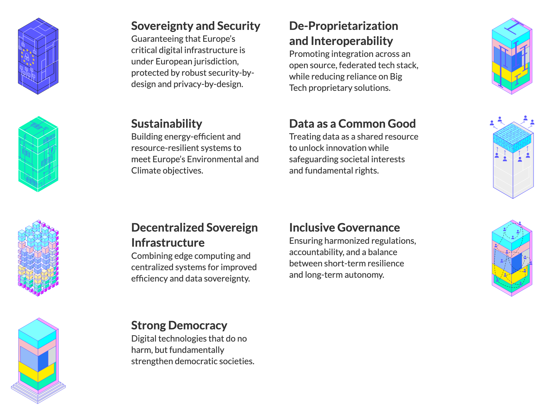 One approach is the Eurostack initiative. Put together by economists and tech policy experts, it aims to “establish the continent as a leader in digital sovereignty.” They suggest a European tech infrastructure made up of microchips, cloud servers, algorithms and AI. Here’s a visualisation of what they’re about: